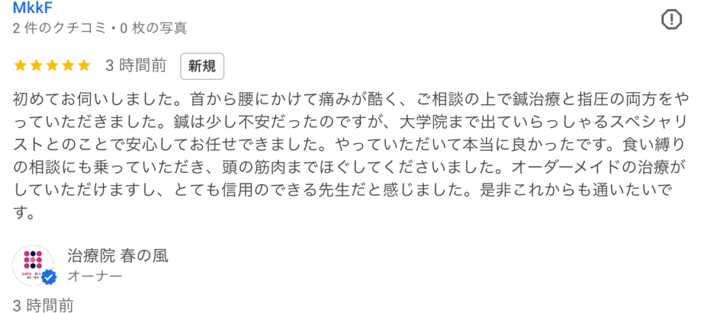 今回は、首・背中・腰の痛みでお悩みの女性から鍼治療をうけた感想をいただきました。