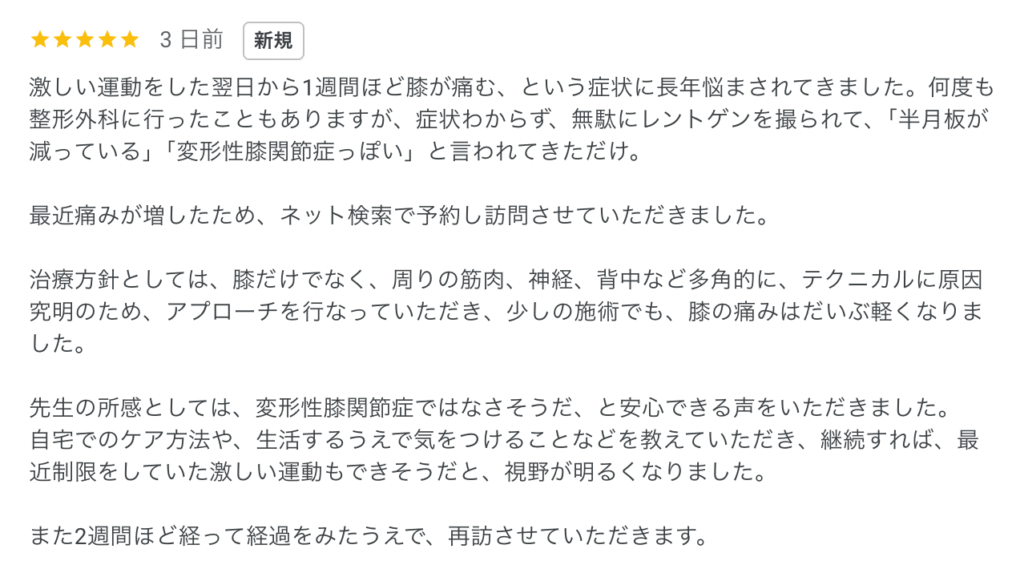 今回は膝の痛みでお悩みの30歳代男性の患者様から喜びの口コミをいただきました。
