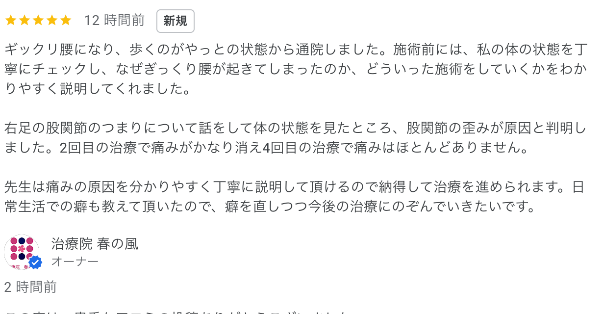今回はギックリ腰でお悩みの女性患者様から症状改善の口コミ投稿いただきました。 ご本人にも症状の発症原因や、今後の対策もさせていただき、再発予防を含めて生活の指導もさせていただきました。 腰痛やギックリ腰で同様にお悩みの方 […]